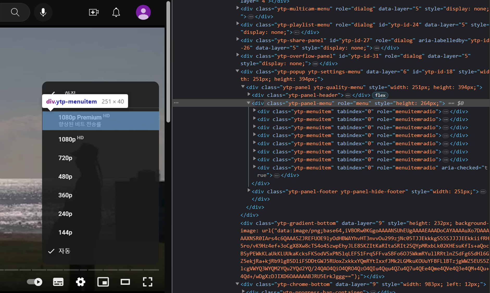 화질 메뉴는 'ytp-id-18' div의 .lastChild.lastChild이다.