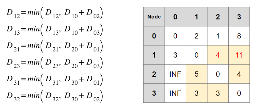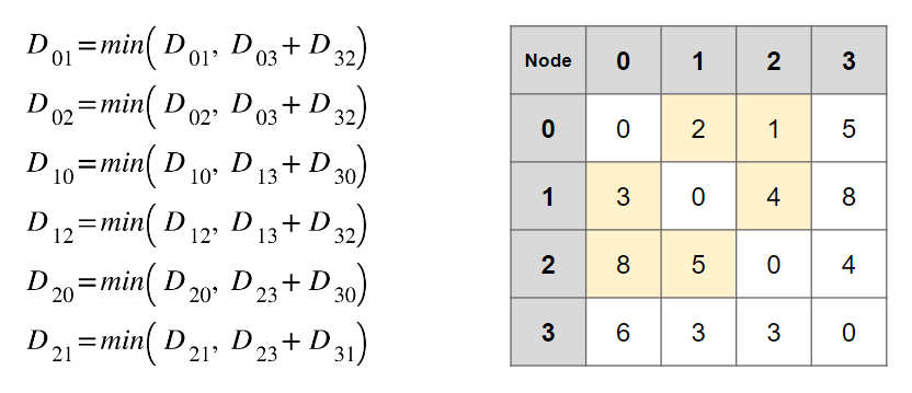 $$ D_{ab}=min(D_{ab}, D_{ak} + D_{kb}) $$