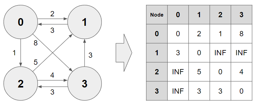 - 이 때 배열의 (a, b) 요소는 a노드에서 b노드까지 경로의 비용이다.