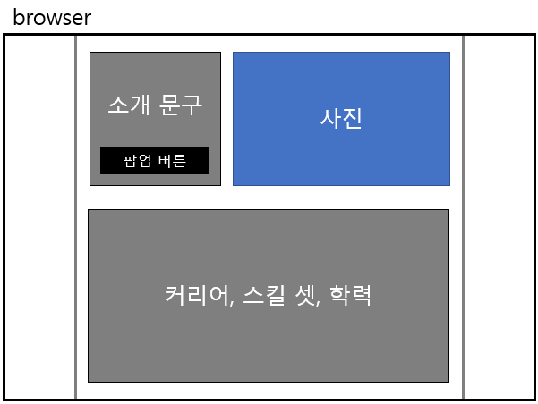 상단 소개문구와 사진은 flex, 하단 설명 파트는 grid를 이용해 구현하였고 내부적으로 flex, grid를 중첩하여 레이아웃을 구성하였다.