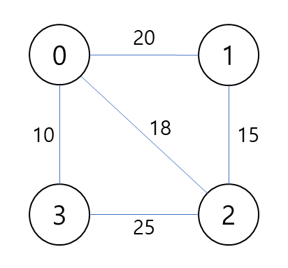 1. 가장 작은 비용을 가진 0-3 간선을 선택한다. 사이클이 아니므로 신장 트리에 추가한다.