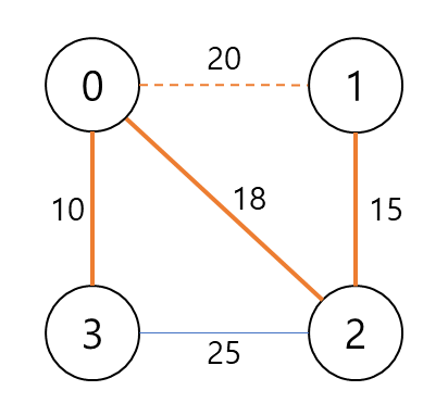 4. 그 다음 작은 비용을 가진 0-1 간선을 선택한다. 사이클이므로 신장 트리에 추가하지 않는다.