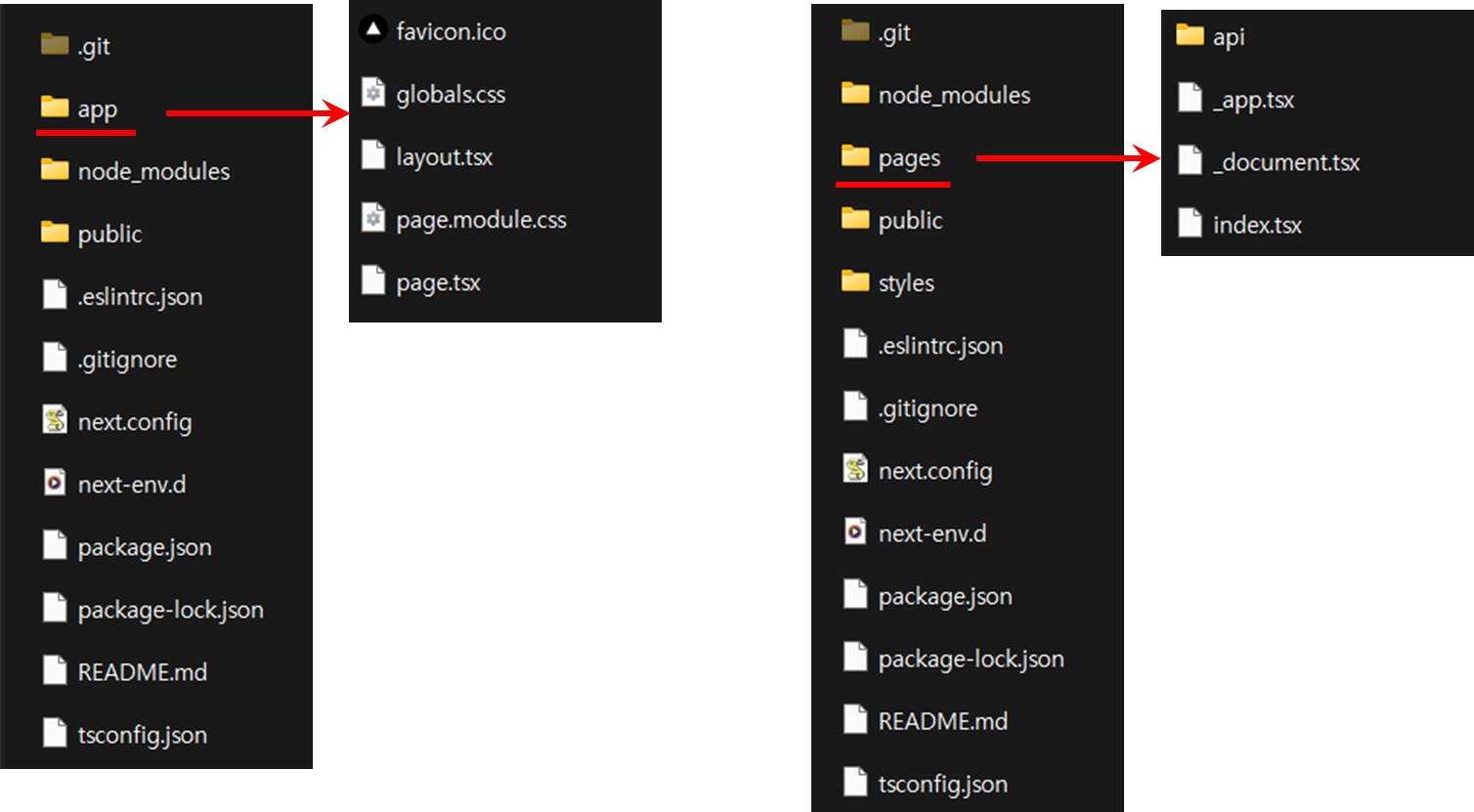 - Next.js version 13 이전에는 pages directory의 React Component를 담고 있는 파일이 하나의 페이지가 되는 방식이었지만 (pages router) version 13부터는 app directory 내부에서 file convention에 따르는 파일들을 사용하여 페이지를 구성 (app router)