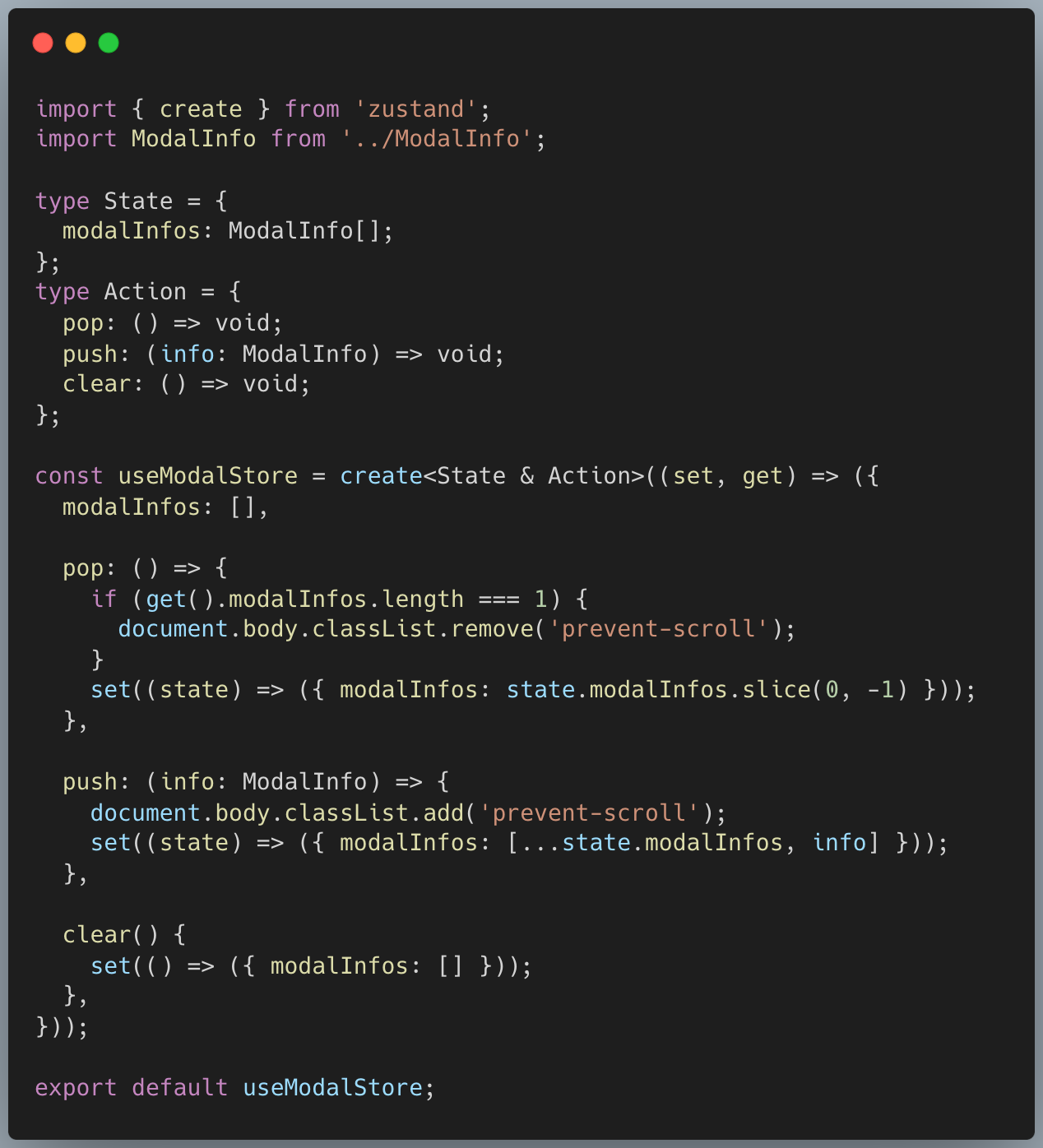 먼저 ModalController와 Context API 관련 코드는 store 하나로 축약 가능하다.
