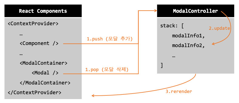 전형적인 Context API를 사용하는 패턴이며 ModalProvider에서 리렌더를 위한 flag setter를 ModalController 생성자에게 넘겨준다.