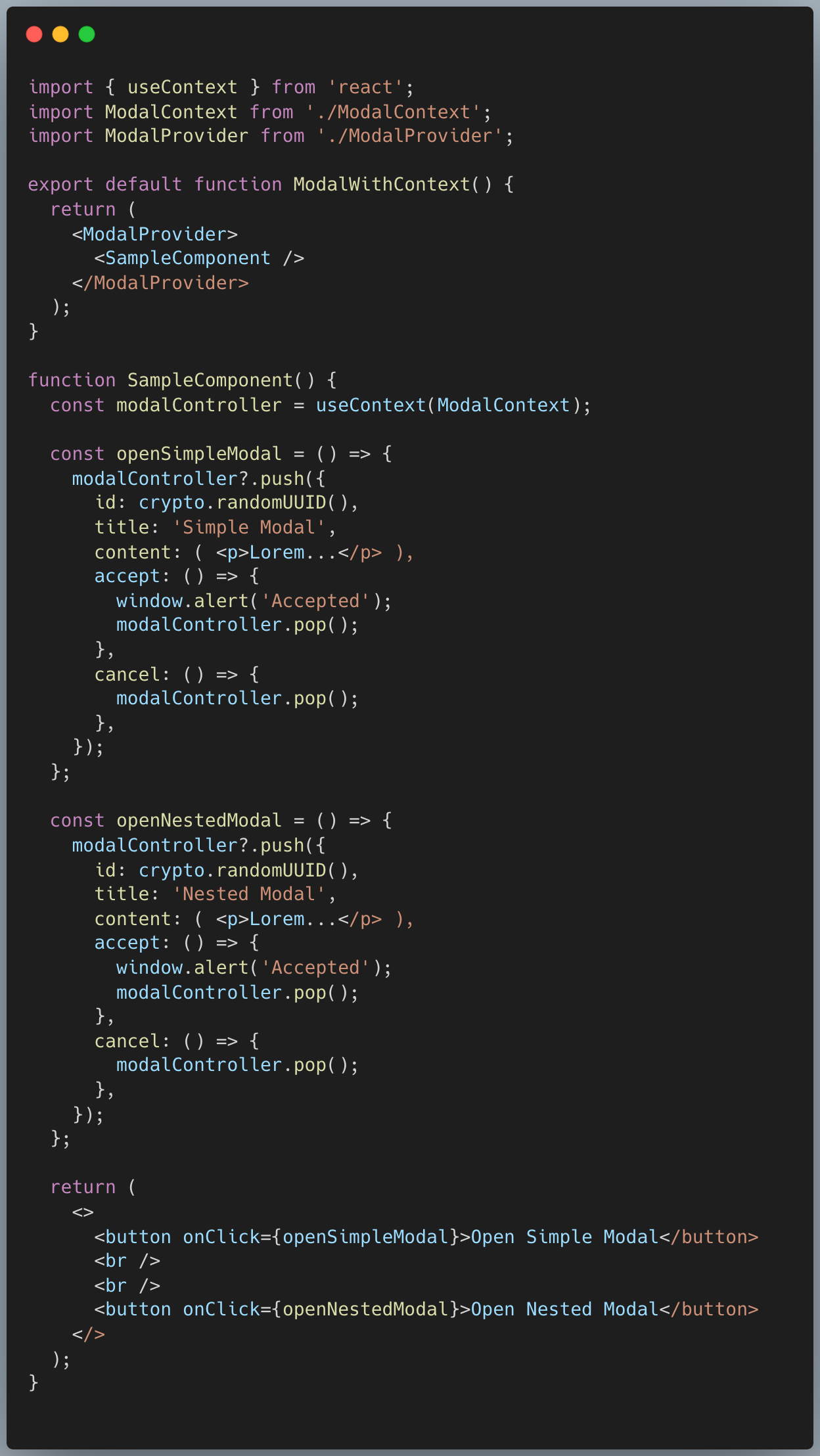 요점은 ModalController에서 stack 구조로 모달을 관리하는 것, 그리고 Context API를 활용해 프로젝트 내부 어디서나 컨트롤러에 접근할 수 있게 하는 것이다.